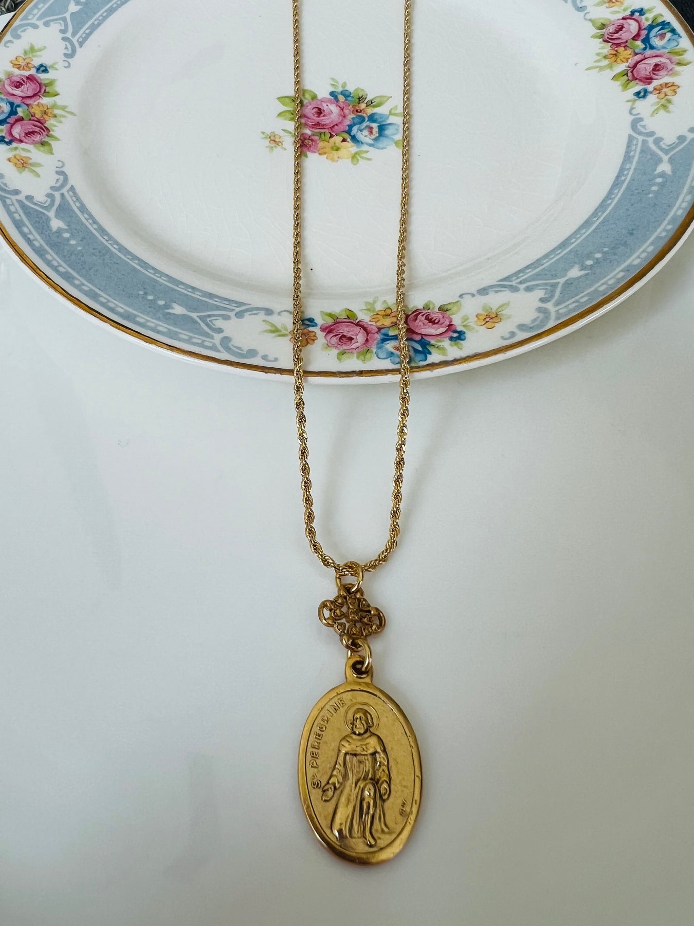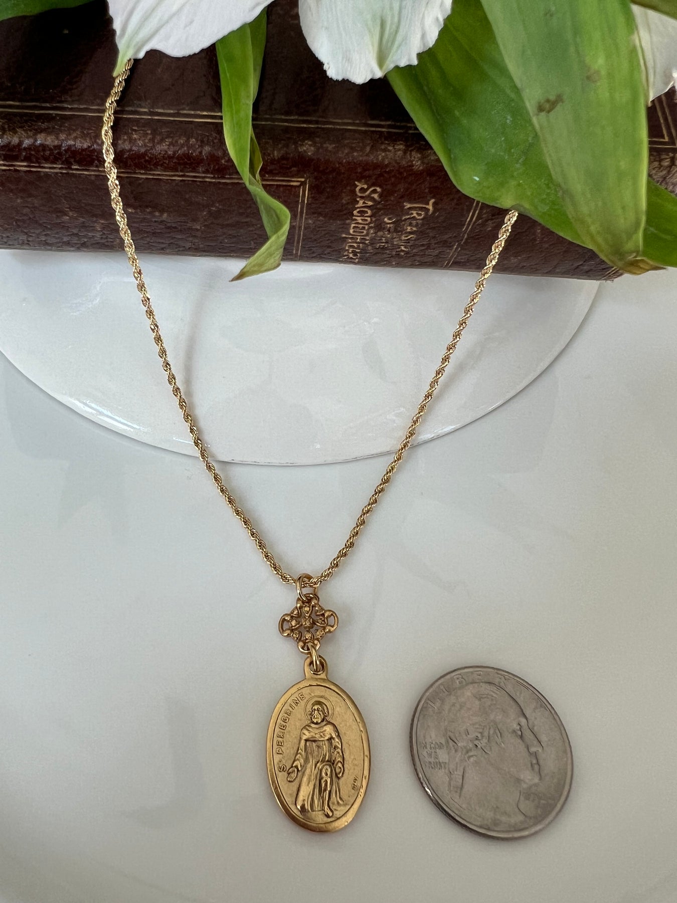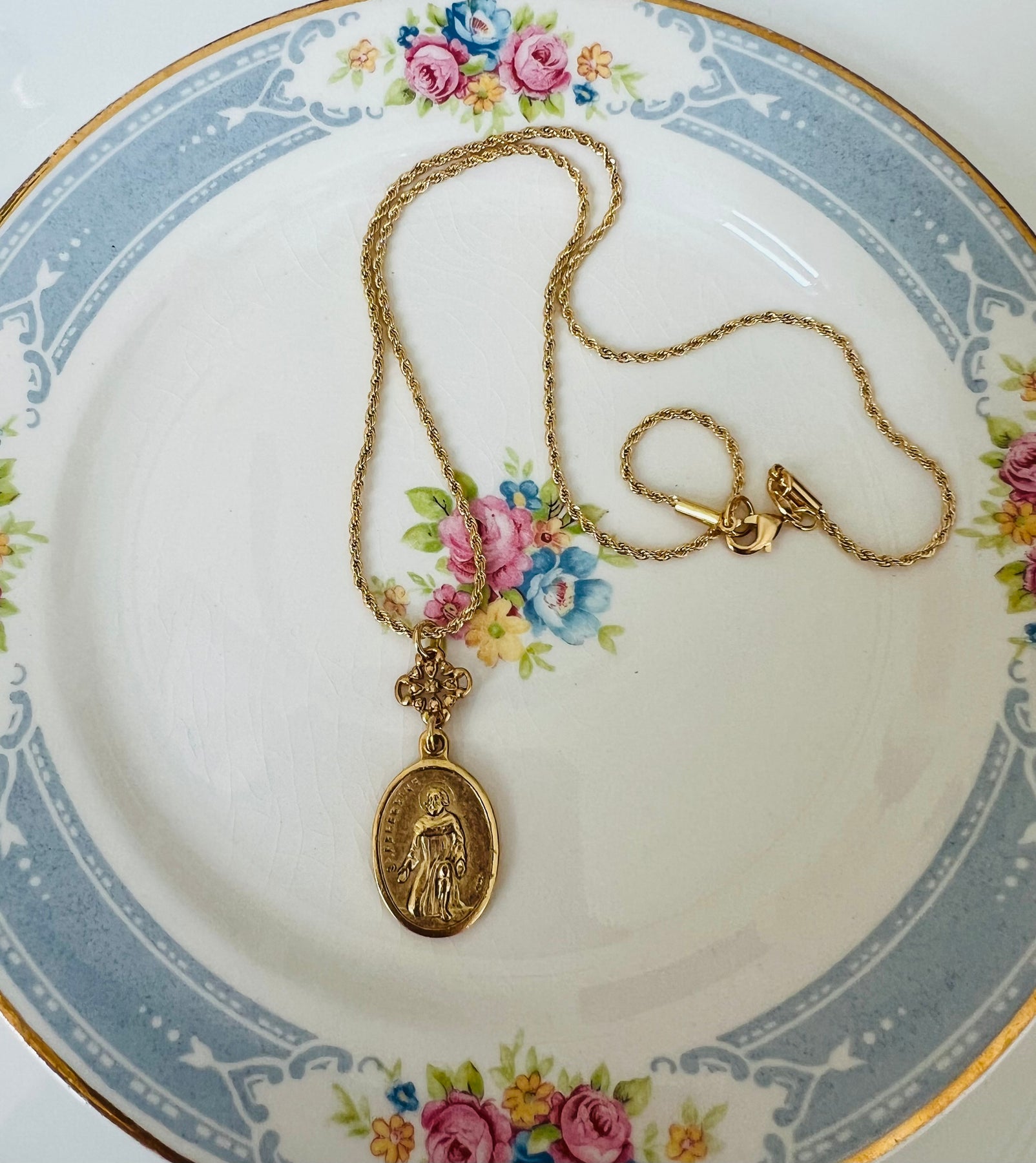 The chain is gold filled. The necklace is crafted in the USA and 18 inches. Each necklace comes with a gift card that reads, "Reinvented Vintage Medallions inspire beautiful jewelry, continuing God’s love and grace as the jewelry travels”