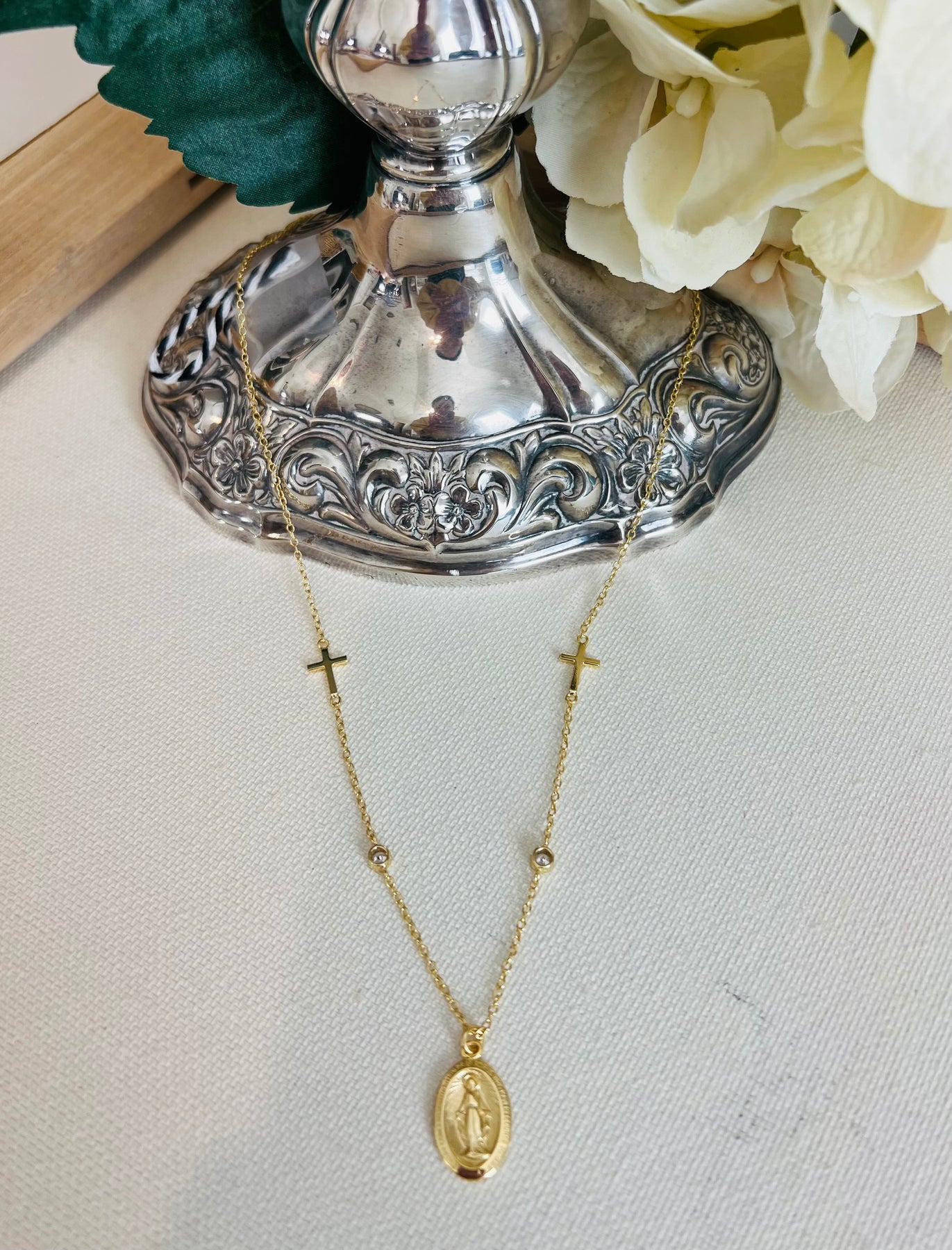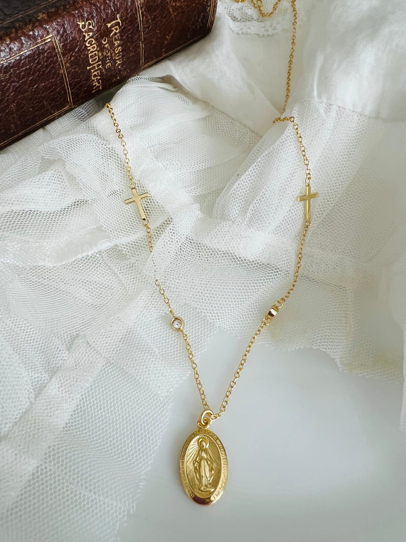 Such style and beauty in this special necklace. The cross and crystal side accents all point toward the beautiful Mary medallion. The necklace is 16 inches with a 2 inch extender. Each necklace comes with a gift card that reads, "Reinvented Vintage Medallions inspire beautiful jewelry, continuing God’s love and grace as the jewelry travels”