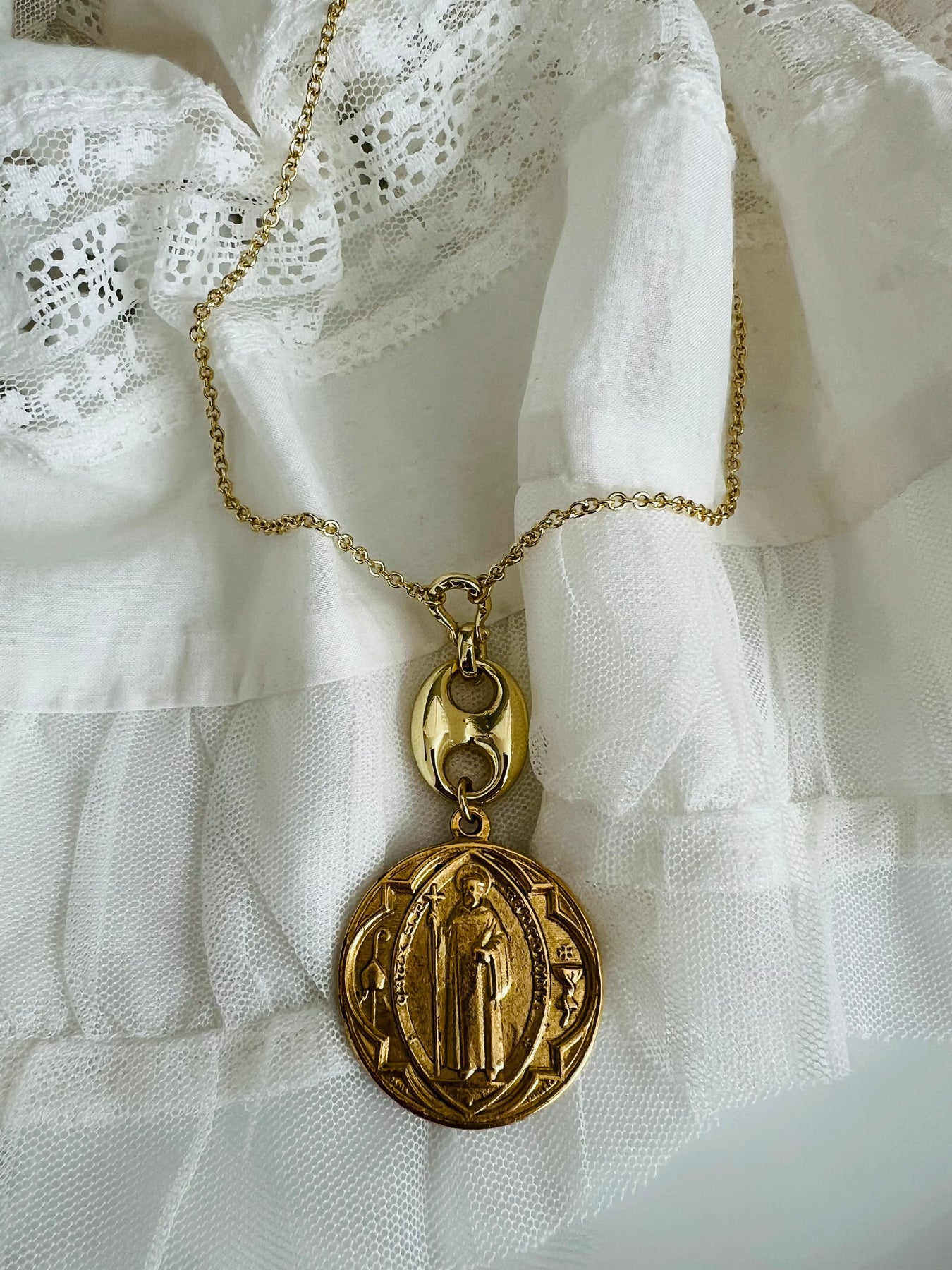 Under the prayerful protection of St. Benedict, this lovely medallion is adorned from a very current and stylish crystal "buckle" drop adornment. The heirloom medallion is imaged from an original antique European medallion. The necklace measure 16" to 18" in length. The chain and medallion are crafted with 14K gold electroplating over lead free brass. Each necklace comes with a gift card that reads, "Reinvented Vintage Medallions inspire beautiful jewelry, continuing God’s love and grace as the jewelry travels.”
