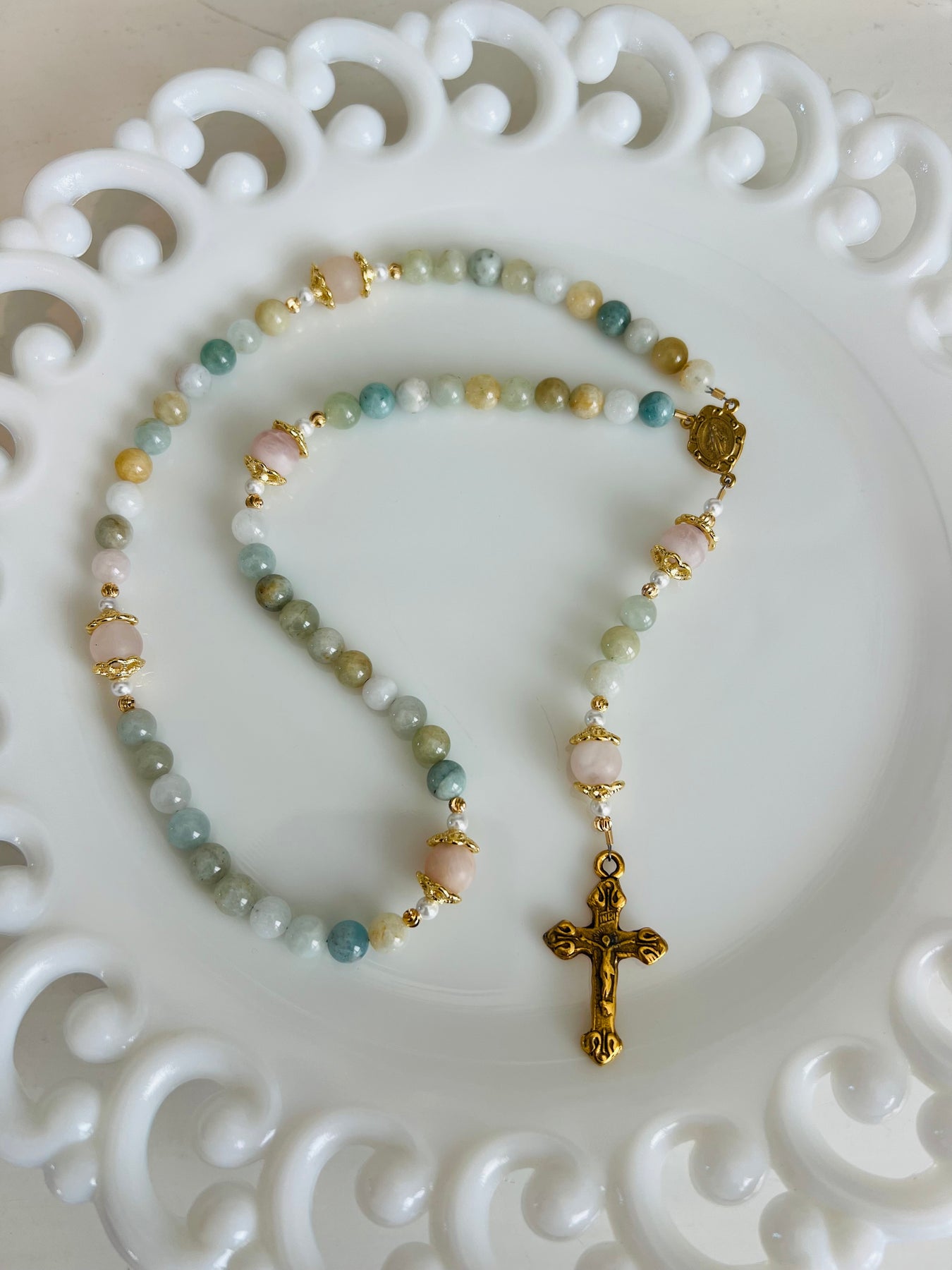 This rosary and every time prayed is in devotion and memory of the beautiful souls lost and now in Jesus's arms at Camp Mystic in the summer of 2025. A truly spectacular rosary with 5 decades of hand beaded aquamarine morganite 6 mm natural stones. The centerpiece is the Miraculous Mary and both centerpiece and crucifix are imaged from original antique European pieces. The rosaries are made in the USA and the medallions are 14 K gold electroplating. The rosary measures approximately 12 inches. Each rosary comes with a gift card that reads, ""Reinvented Vintage Medallions inspire beautiful jewelry, continuing God's love and grace as the jewelry travels."