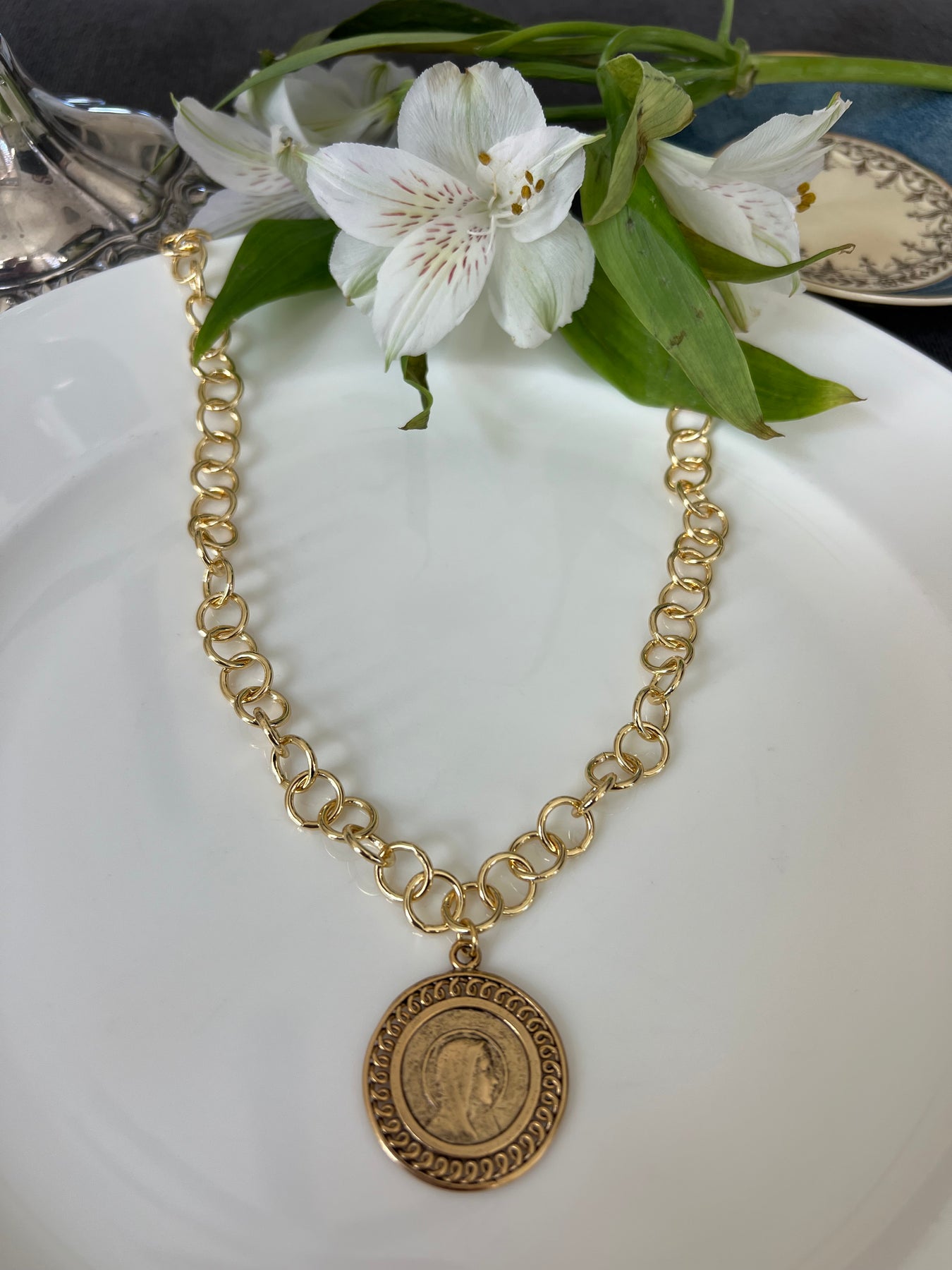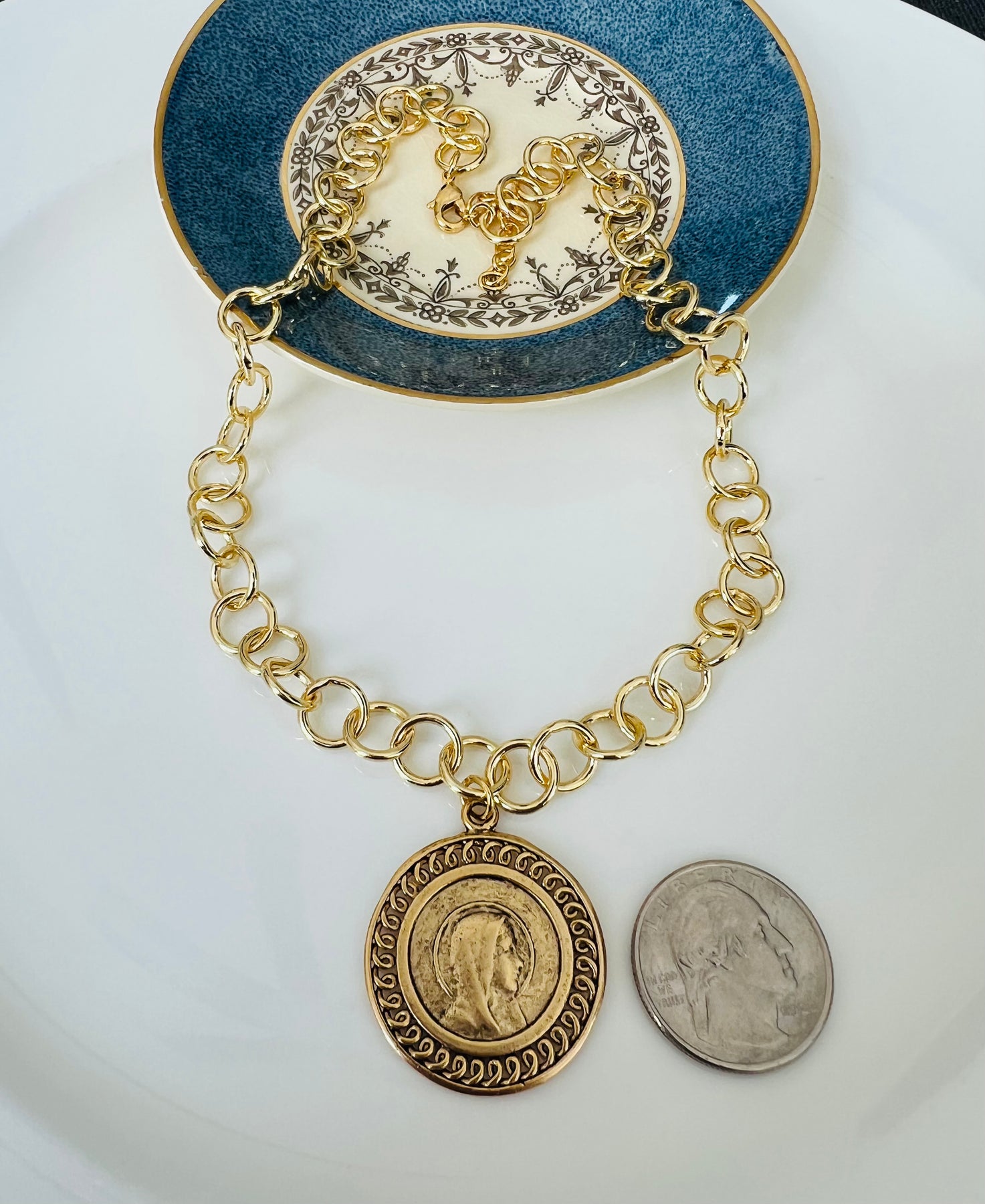 The lovely chain is light yet bubbling with style in gold plating. The necklace is crafted in the USA and available in 2 lengths - 16 or 18 inches. Each necklace comes with a gift card that reads, "Reinvented Vintage Medallions inspire beautiful jewelry, continuing God’s love and grace as the jewelry travels”