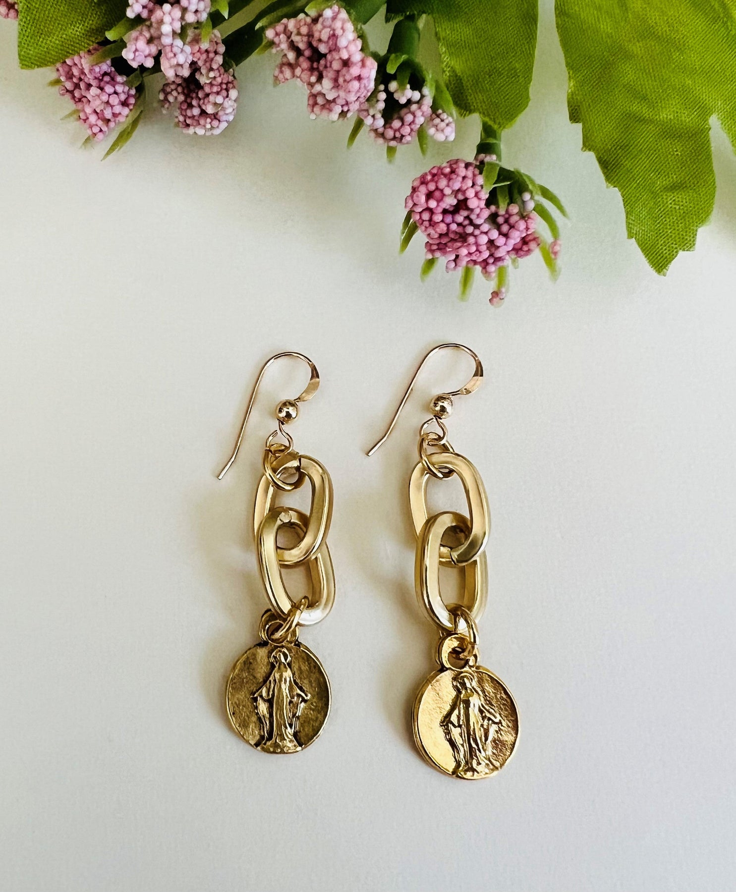 Beautiful petite Miraculous Mary earrings hung from a gorgeous matte chain and from gold filled ear wires. The medallion is imaged from an antique or vintage European medallion. Each pair of earrings is hung from a gift card which reads "Reinvented vintage medallions inspire beautiful jewelry, continuing God's love and grace as the jewelry travels."
