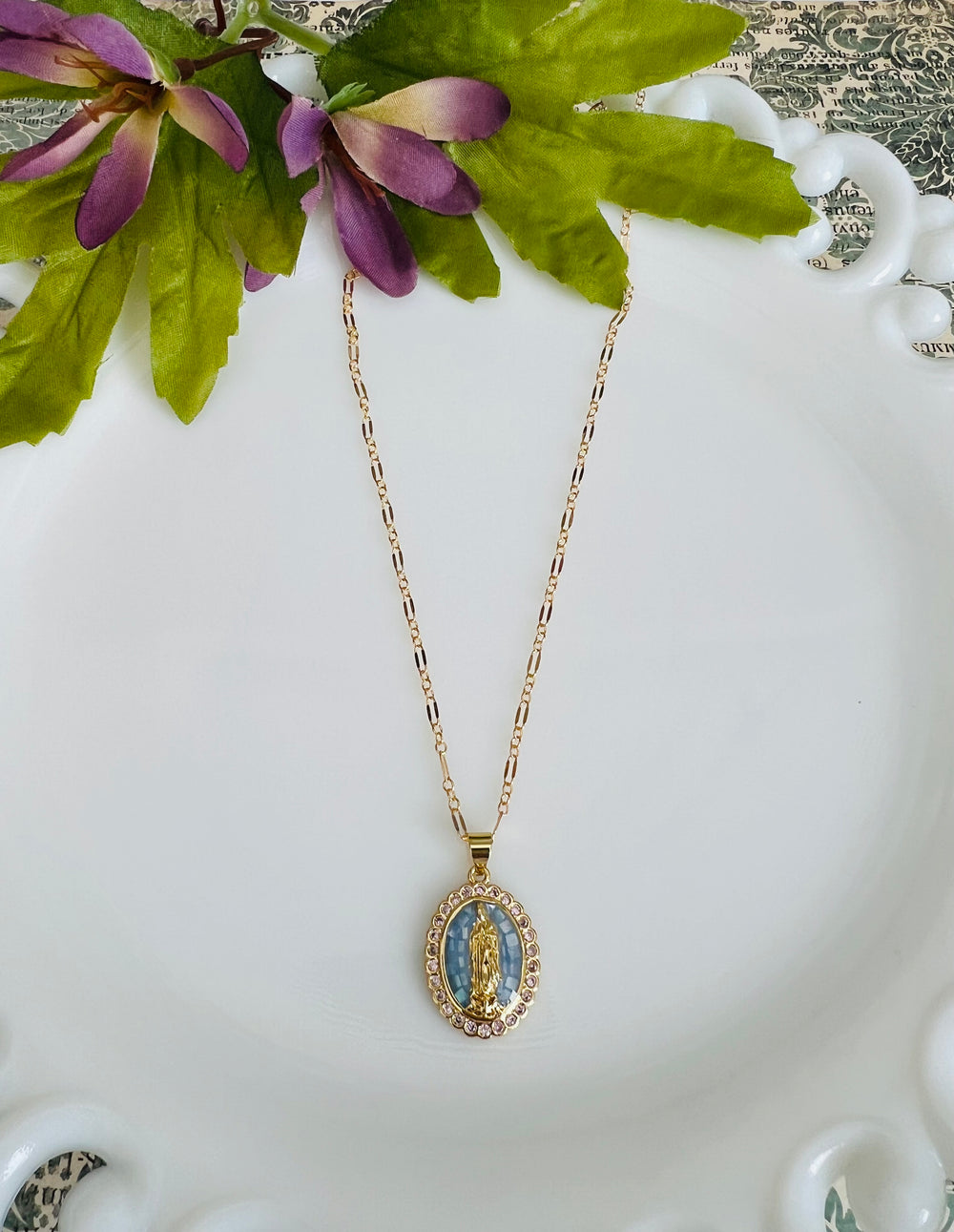 A beautiful blue stained glass etched Mary medallion with crystal and gold with a hint of pale pink surrounding her. The lovely chain is intricate and beautiful in gold filled. The necklace is crafted in the USA and is 18 inches. Each necklace comes with a gift card that reads, "Reinvented Vintage Medallions inspire beautiful jewelry, continuing God’s love and grace as the jewelry travels”