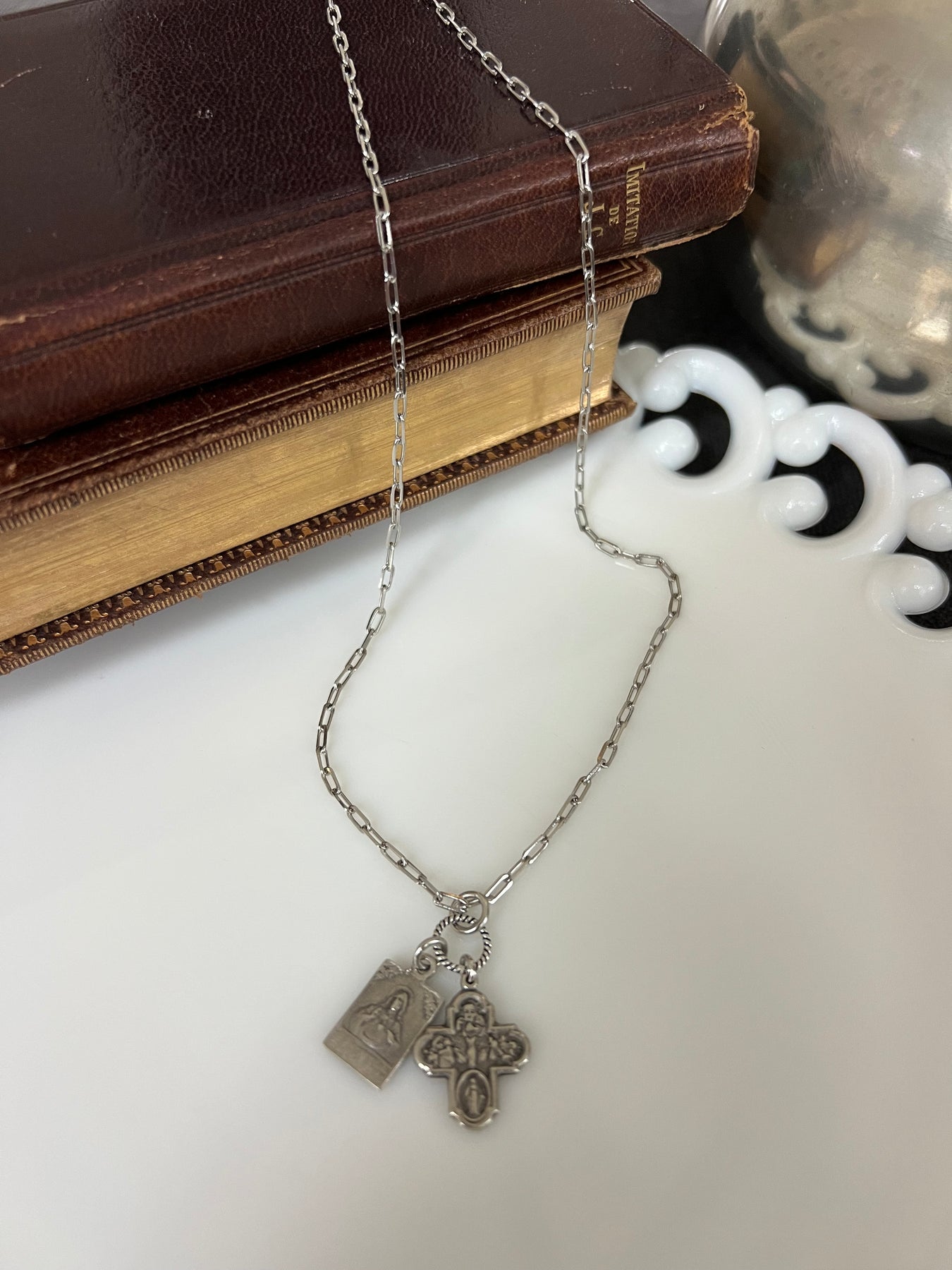 This meaningful silver necklace brings together two beloved Catholic sacramentals in one timeless design.