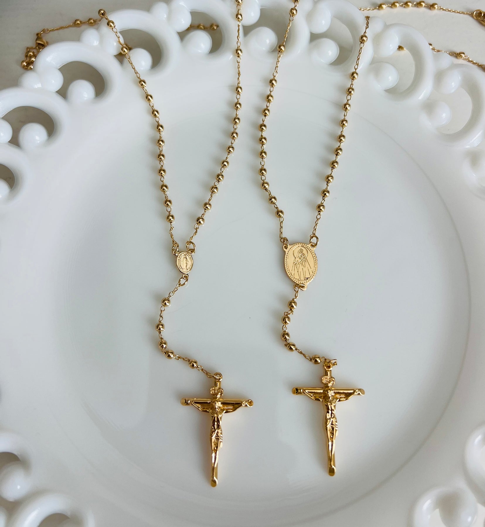 A gorgeous rosary with 5 decades of 3mm gold balls and choice of heirloom centerpiece and crucifix. The smaller centerpiece is a beautiful Miraculous Mary medal and the slightly larger is an etched Blessed Mother holding baby Jesus. The rosary measures approximately 12 1/2 to 13 1/2 inches. Each rosary comes with a gift card that reads, ""Reinvented Vintage Medallions inspire beautiful jewelry, continuing God's love and grace as the jewelry travels."