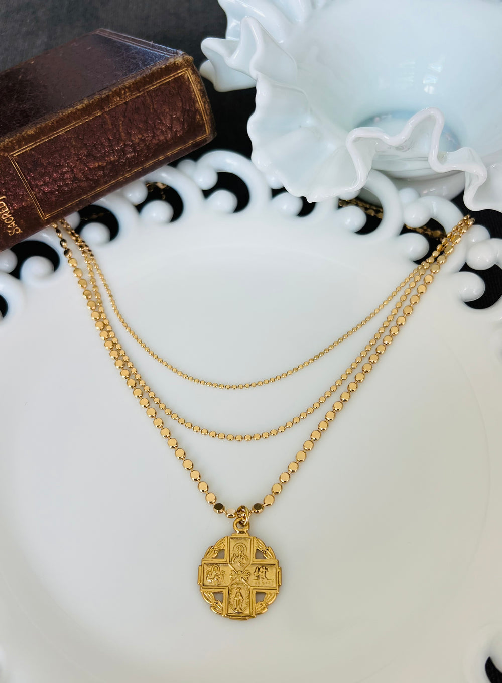 Three strand necklace with gold filled chains in a lovely layered design accenting a Four Way Cross medallion.