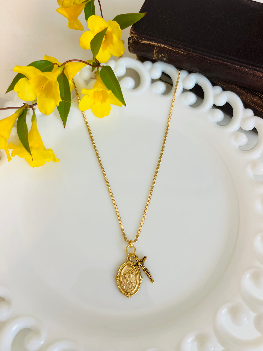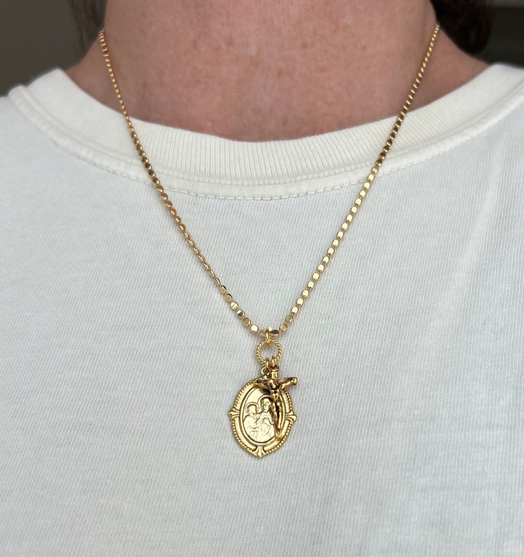 The necklace measure 18" and is available with an added crucifix. Either selection is a beautiful tribute and reminder of our faith. Each necklace comes with a gift card that reads, "Reinvented Vintage Medallions inspire beautiful jewelry, continuing God’s love and grace as the jewelry travels.”