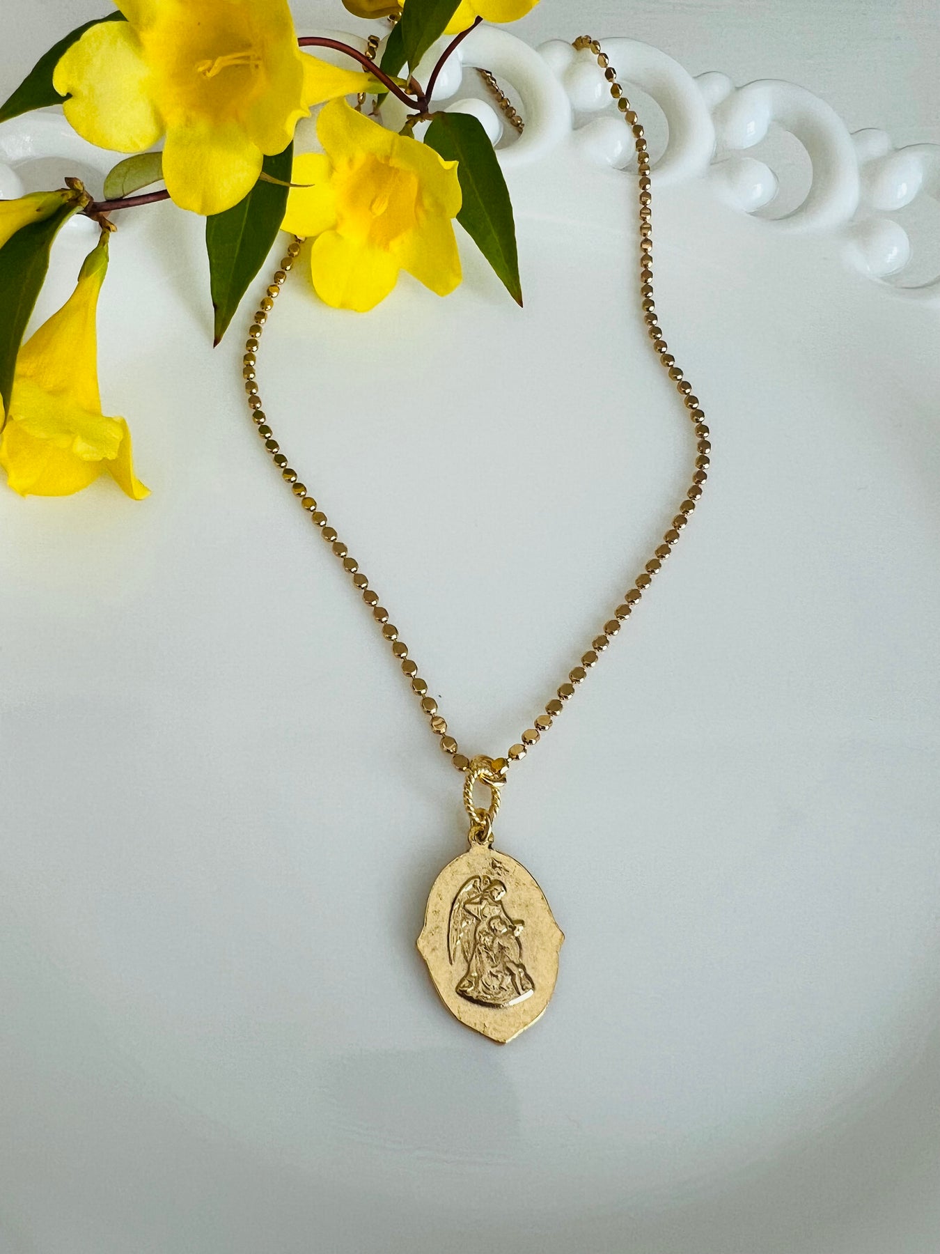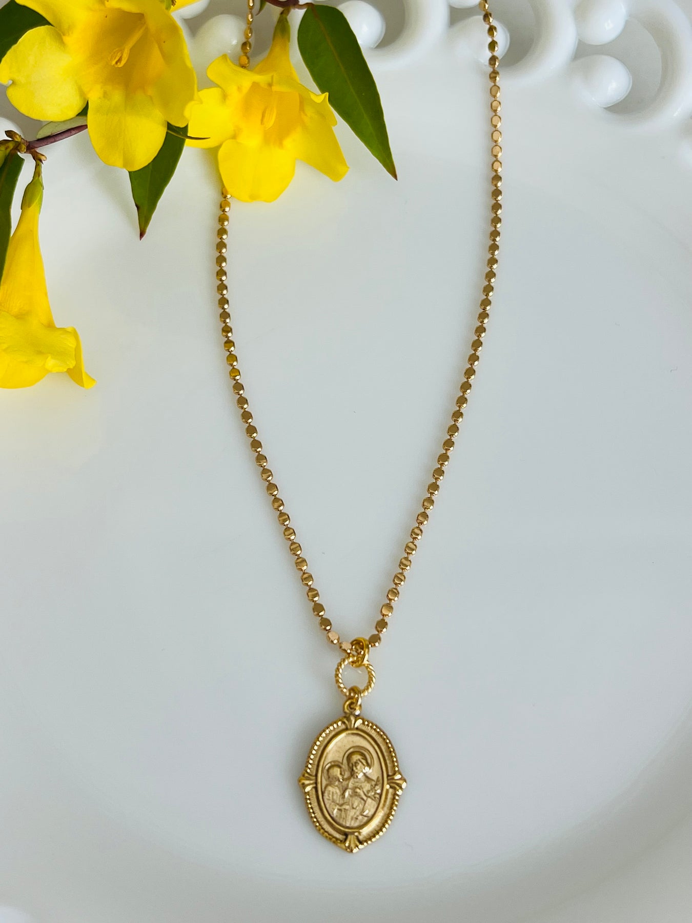 A timeless St. Joseph medallion necklace honoring the quiet strength and steadfast love of the earthly father of Jesus. St. Joseph depicted holding the child Jesus - a symbol of protection, provision and faithful obedience. The reverse side of St. Joseph is imaged with child and guardian angel - also a fitting compliment to St. Joseph.