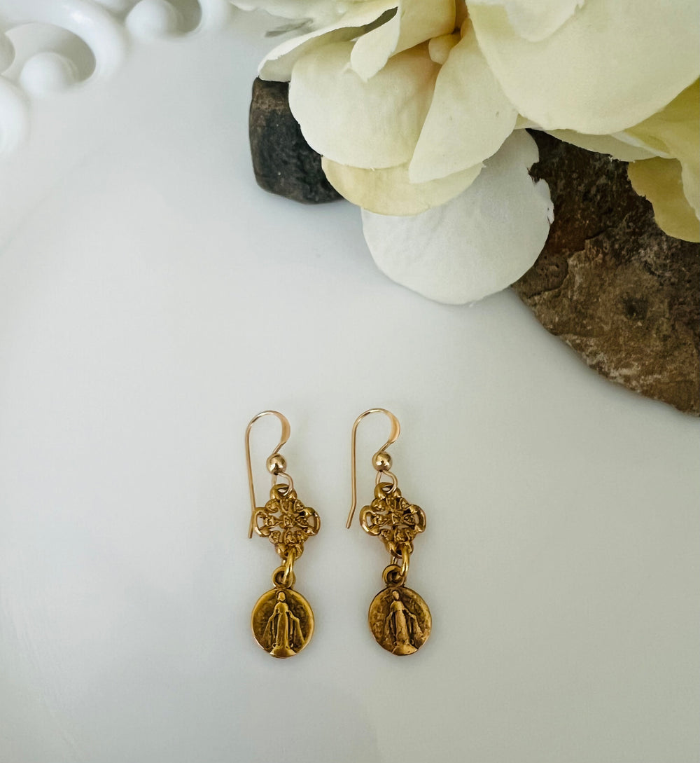 Beautiful petite round Immaculate Mary medals adorned with a lovely ornate connector. The medal is hung from gold filled ear wires. The medallion is imaged from an antique or vintage European medallion. Each pair of earrings is hung from a gift card which reads "Reinvented vintage medallions inspire beautiful jewelry, continuing God's love and grace as the jewelry travels."